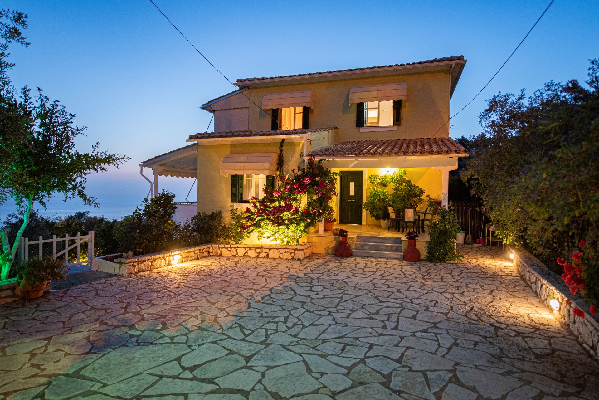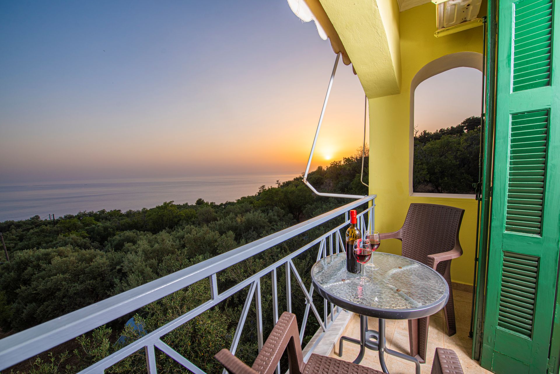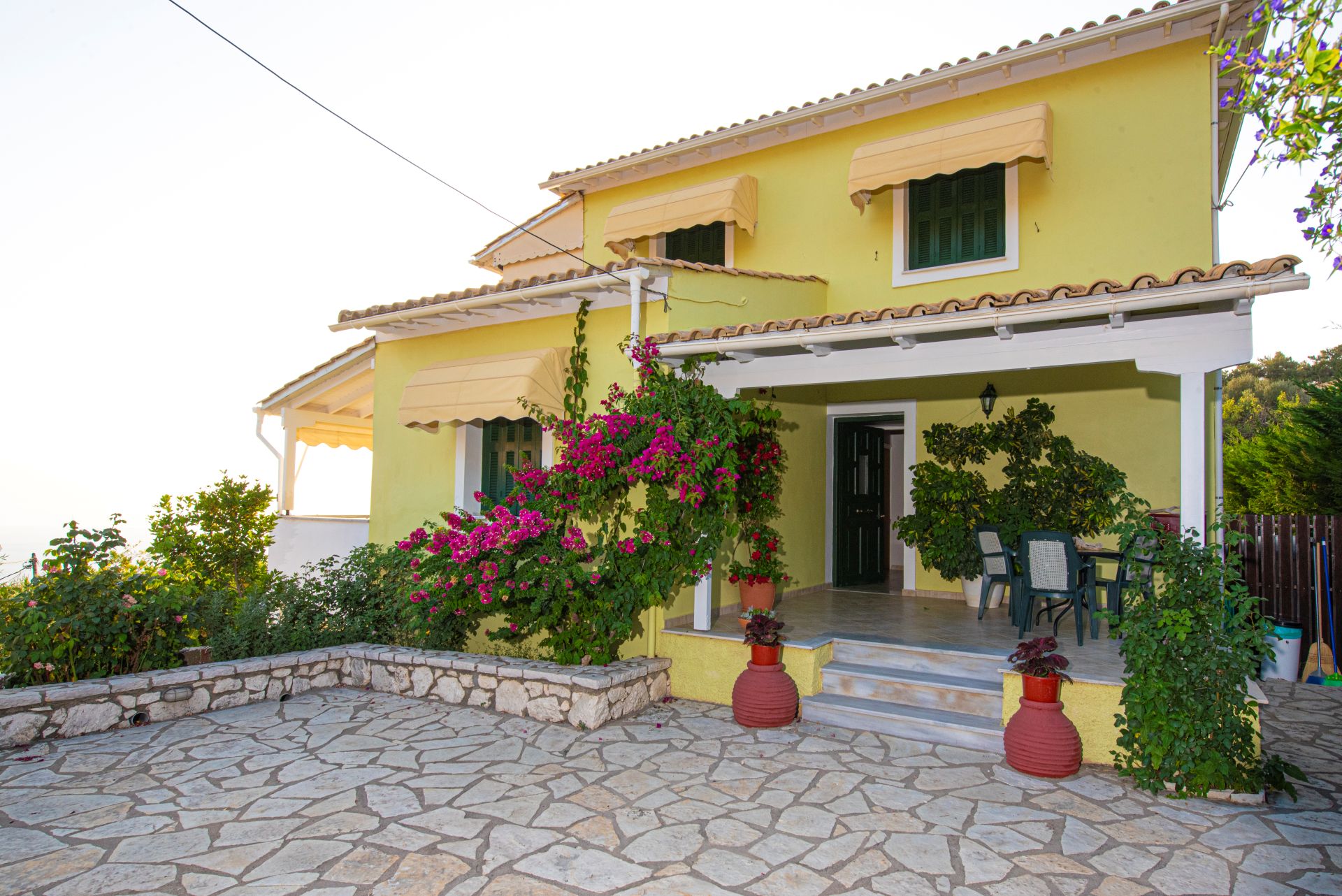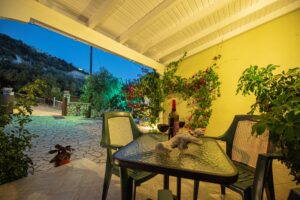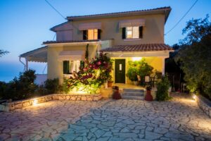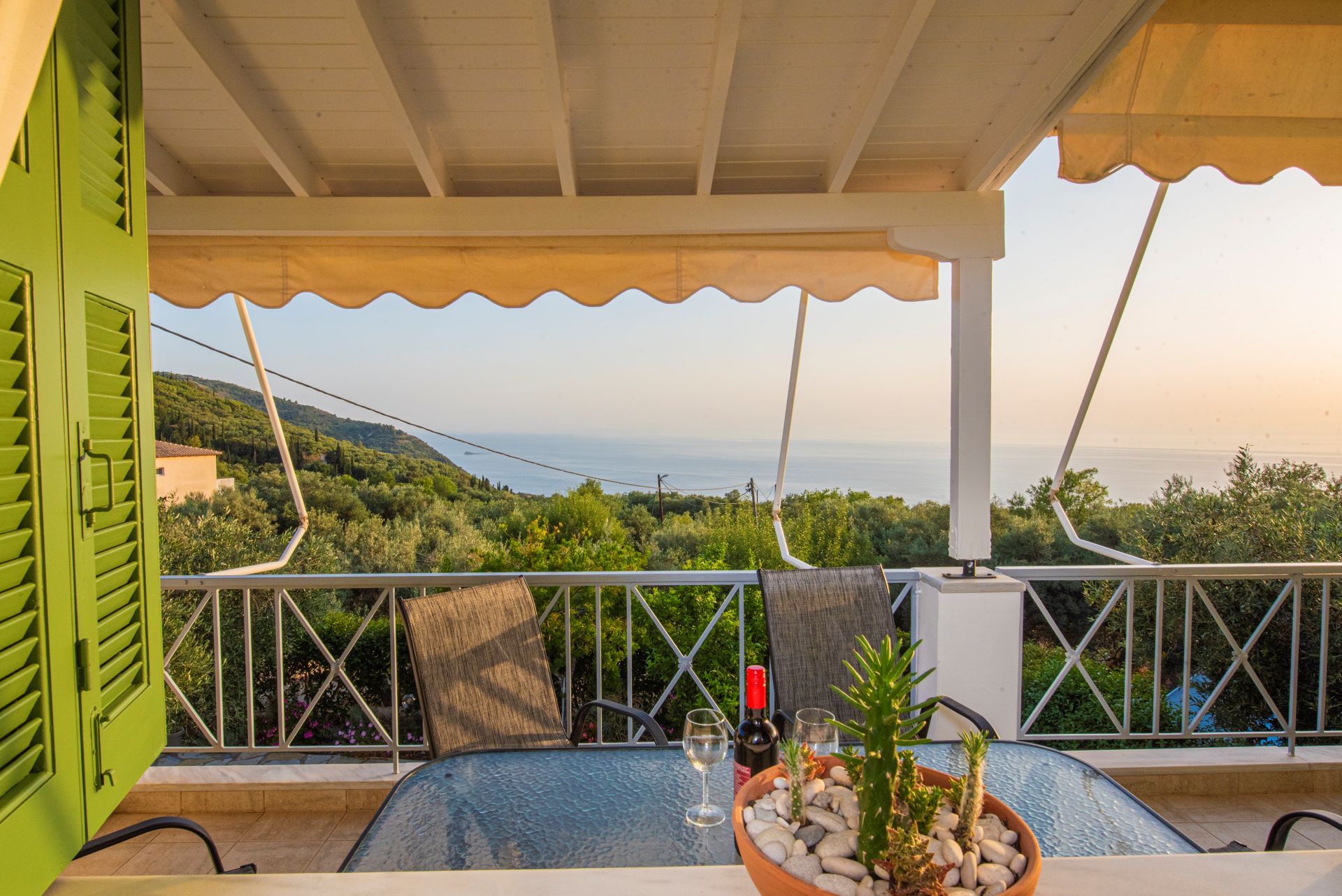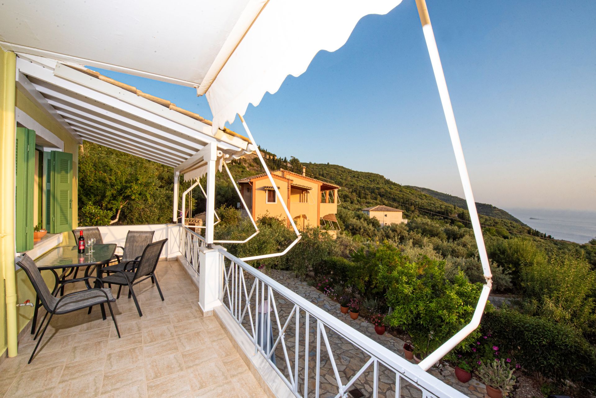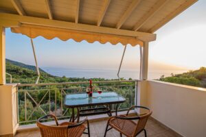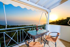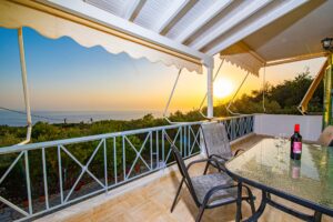 Η βίλα έχει μπαλκόνια εξοπλισμένα με τραπέζια και καρέκλες και εκπληκτική θέα στο Ιόνιο Πέλαγος. Ειδικά στο ηλιοβασίλεμα.