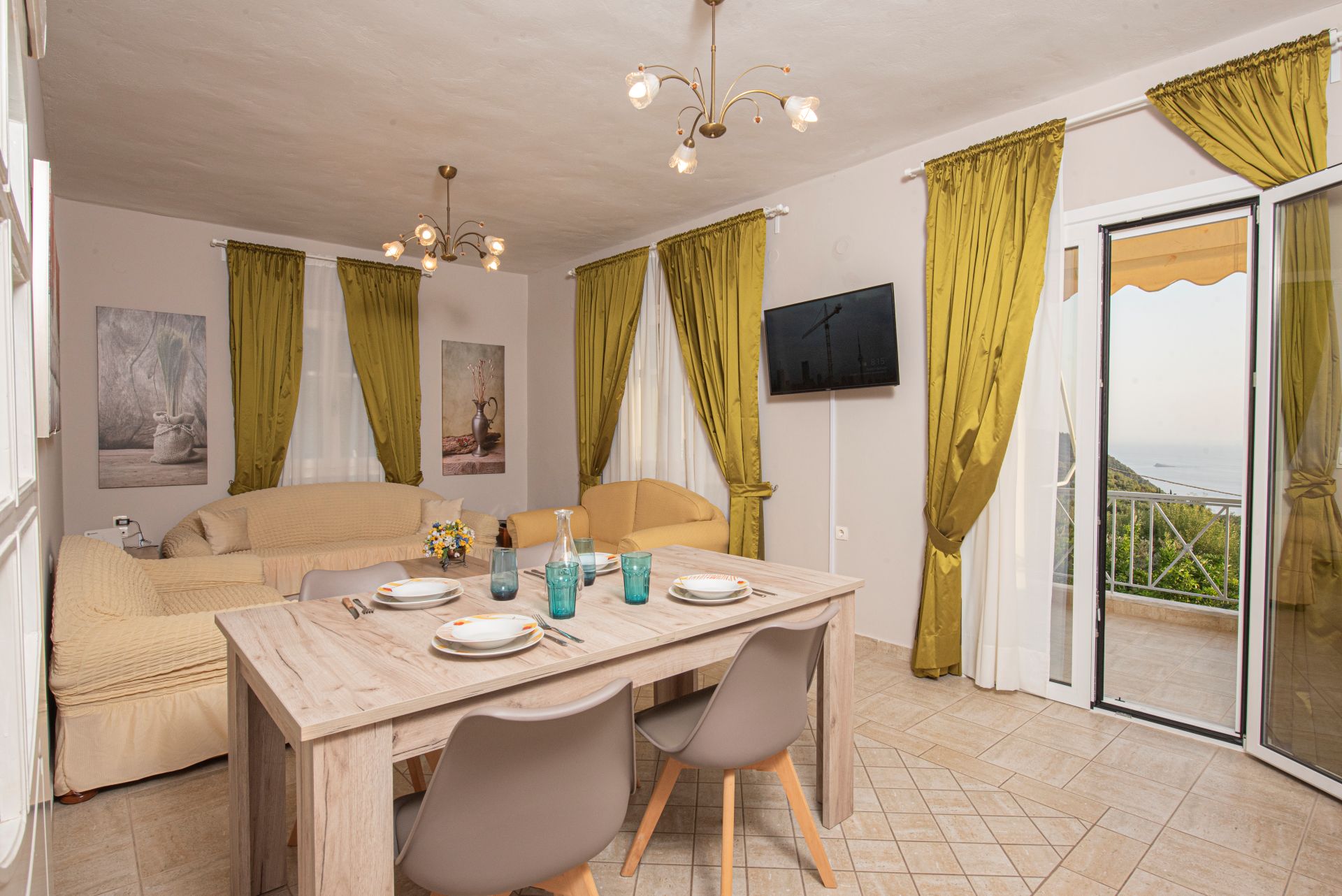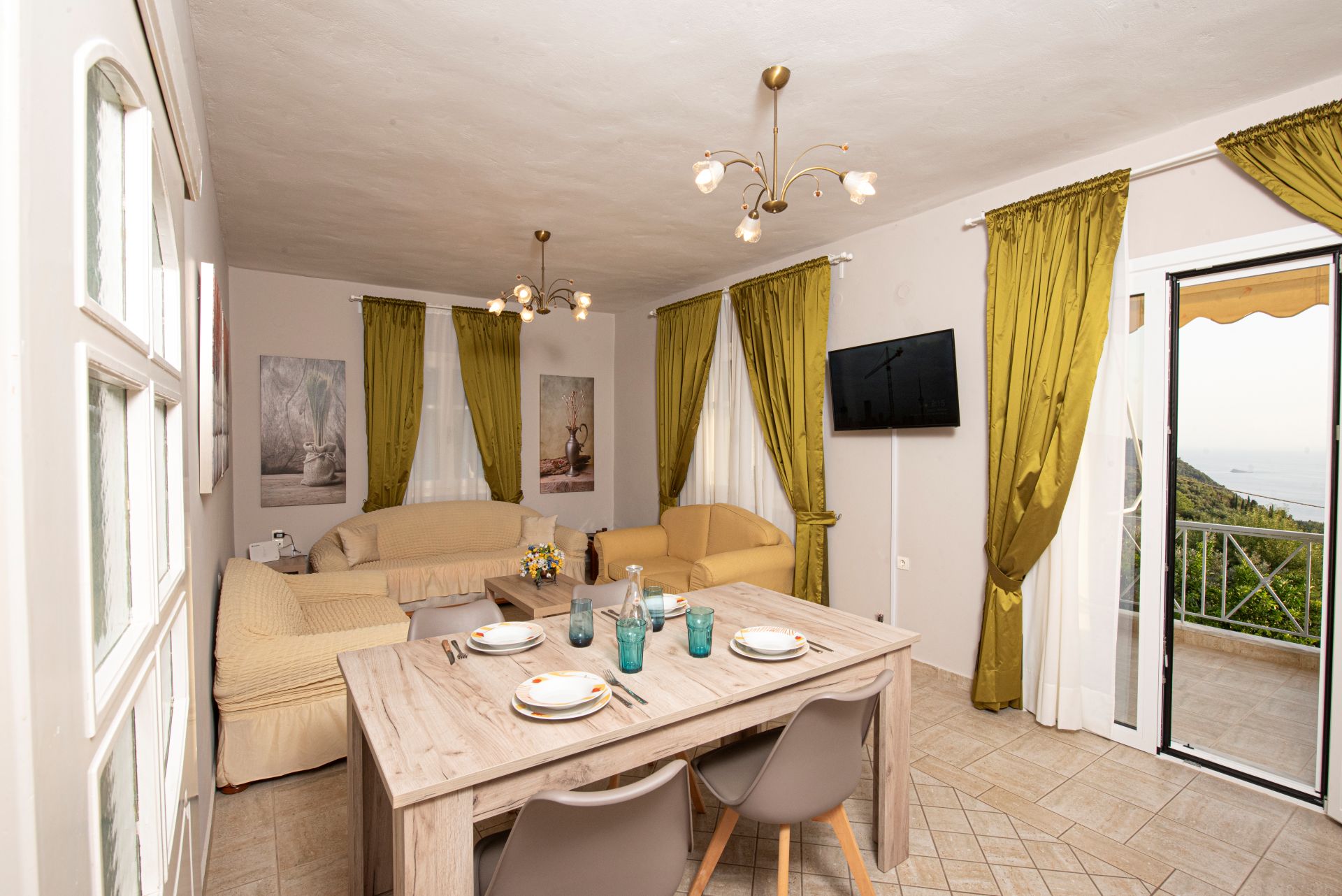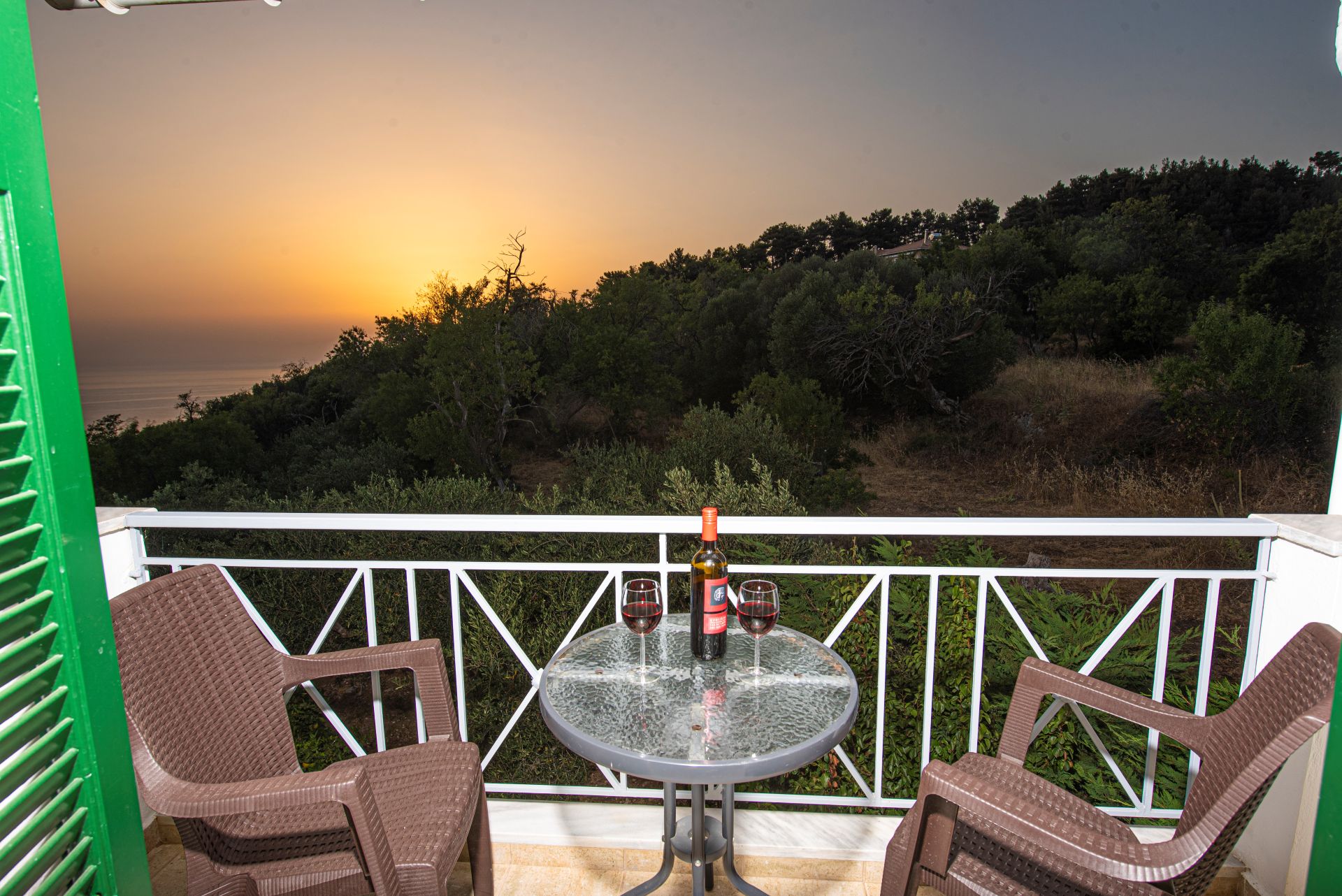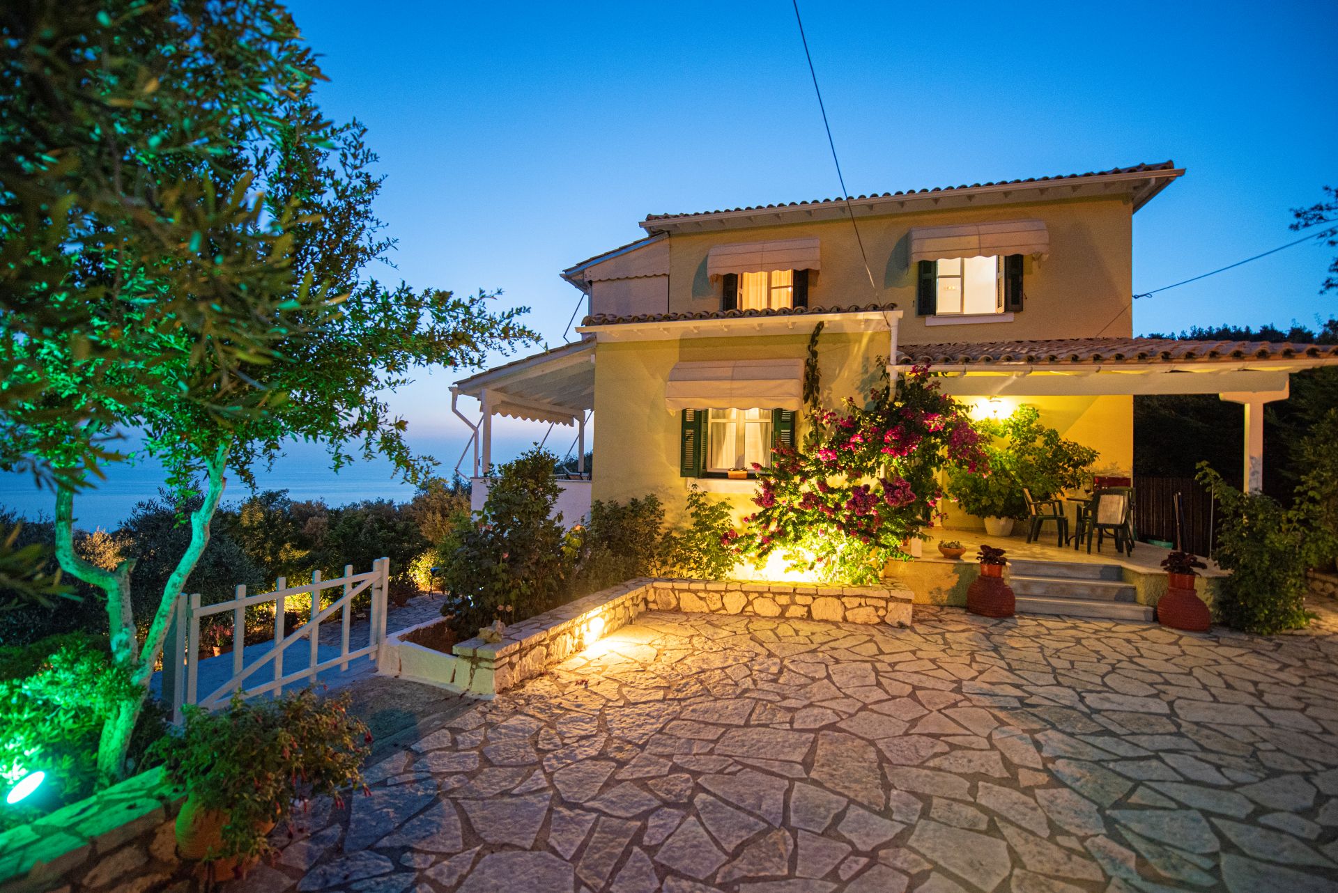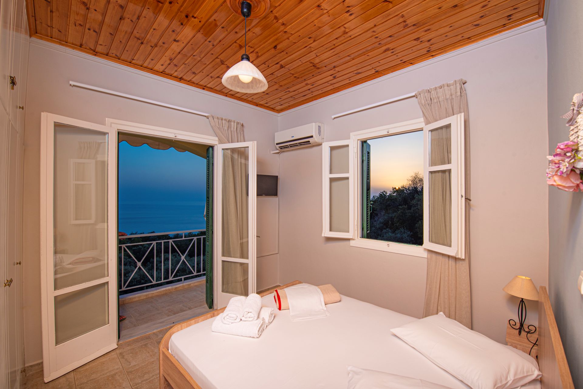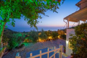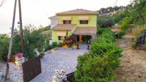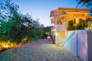 Η βίλα έχει μπαλκόνια εξοπλισμένα με τραπέζια και καρέκλες και εκπληκτική θέα στο Ιόνιο Πέλαγος. Ειδικά στο ηλιοβασίλεμα.