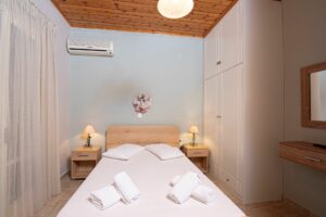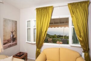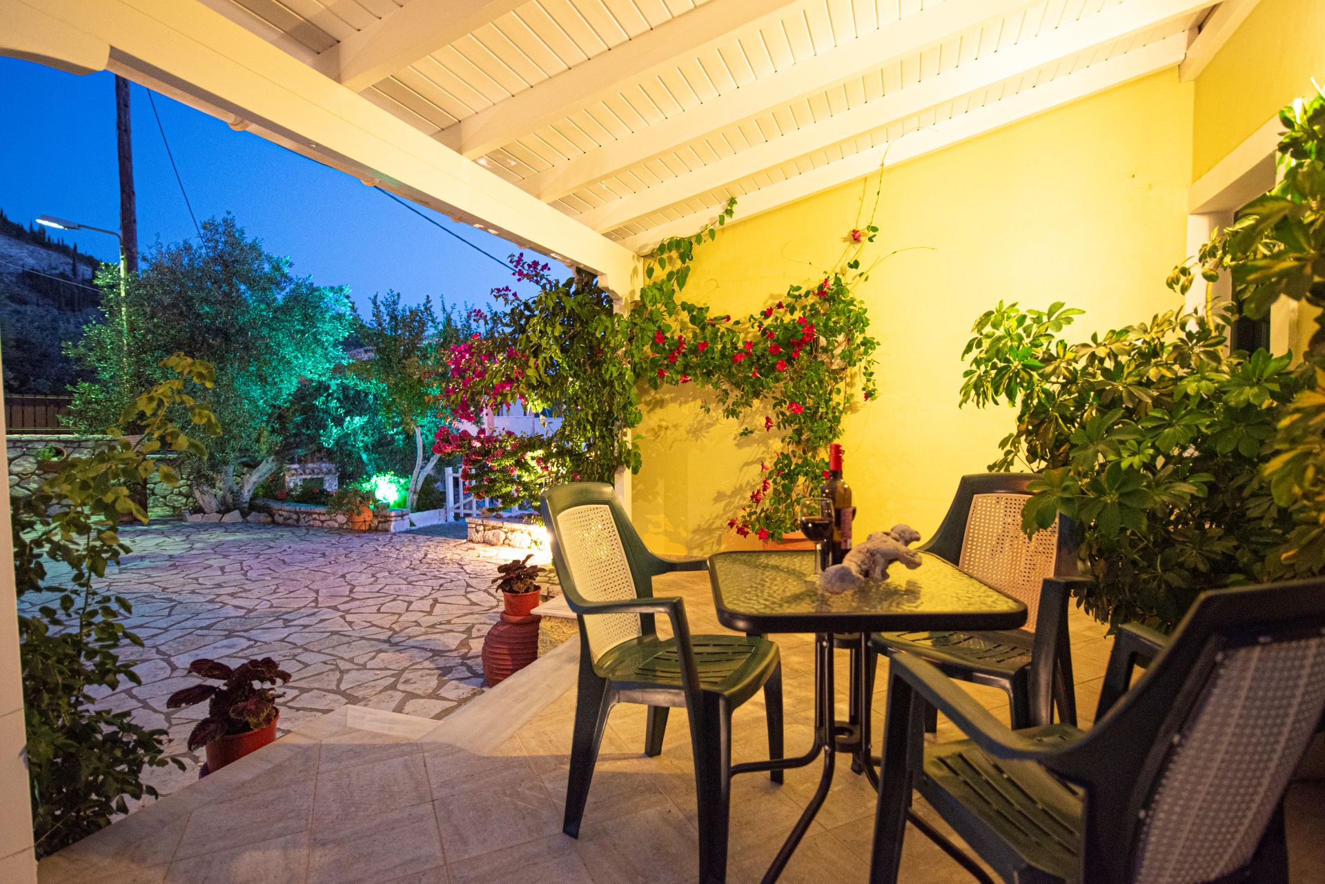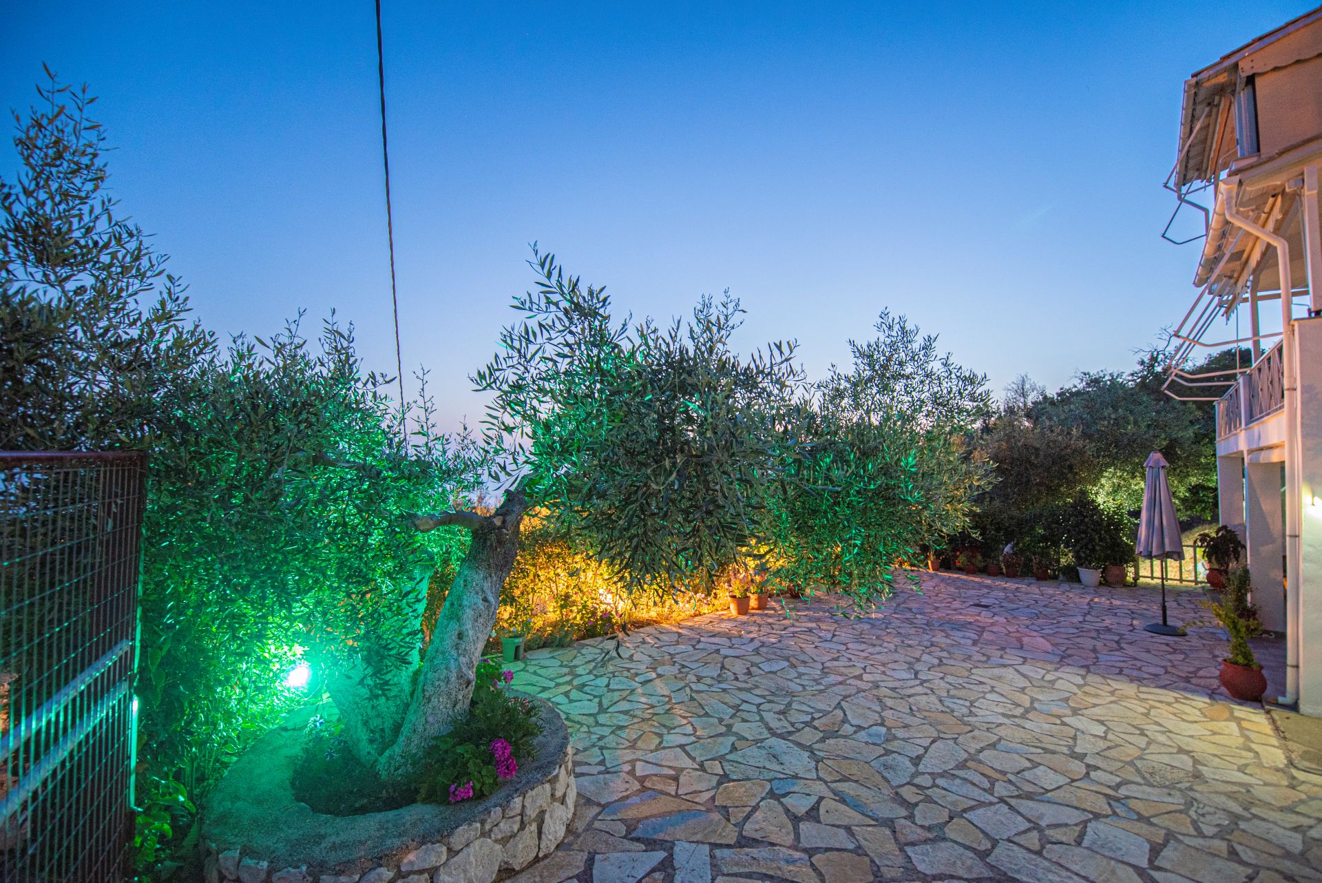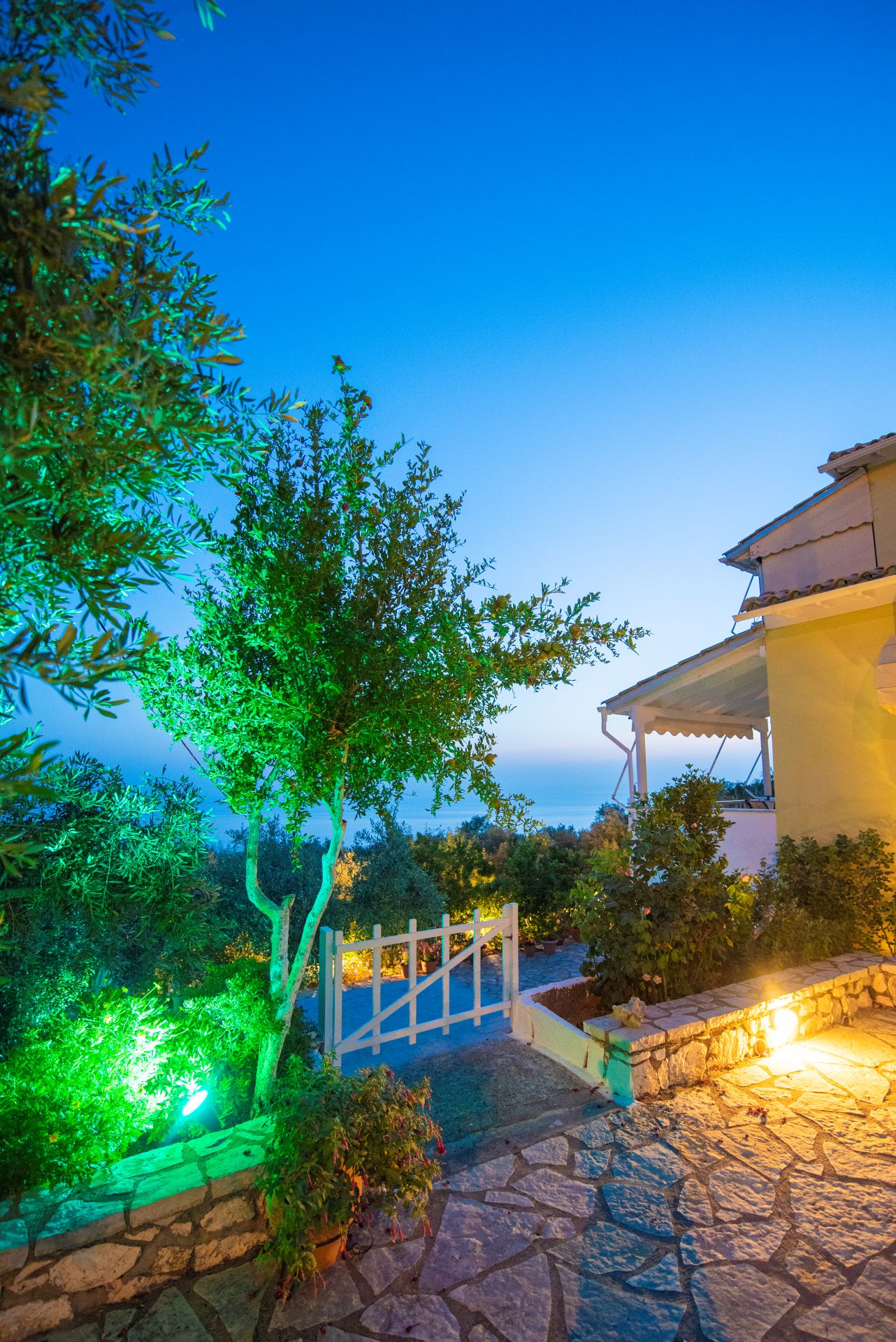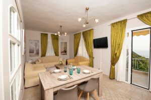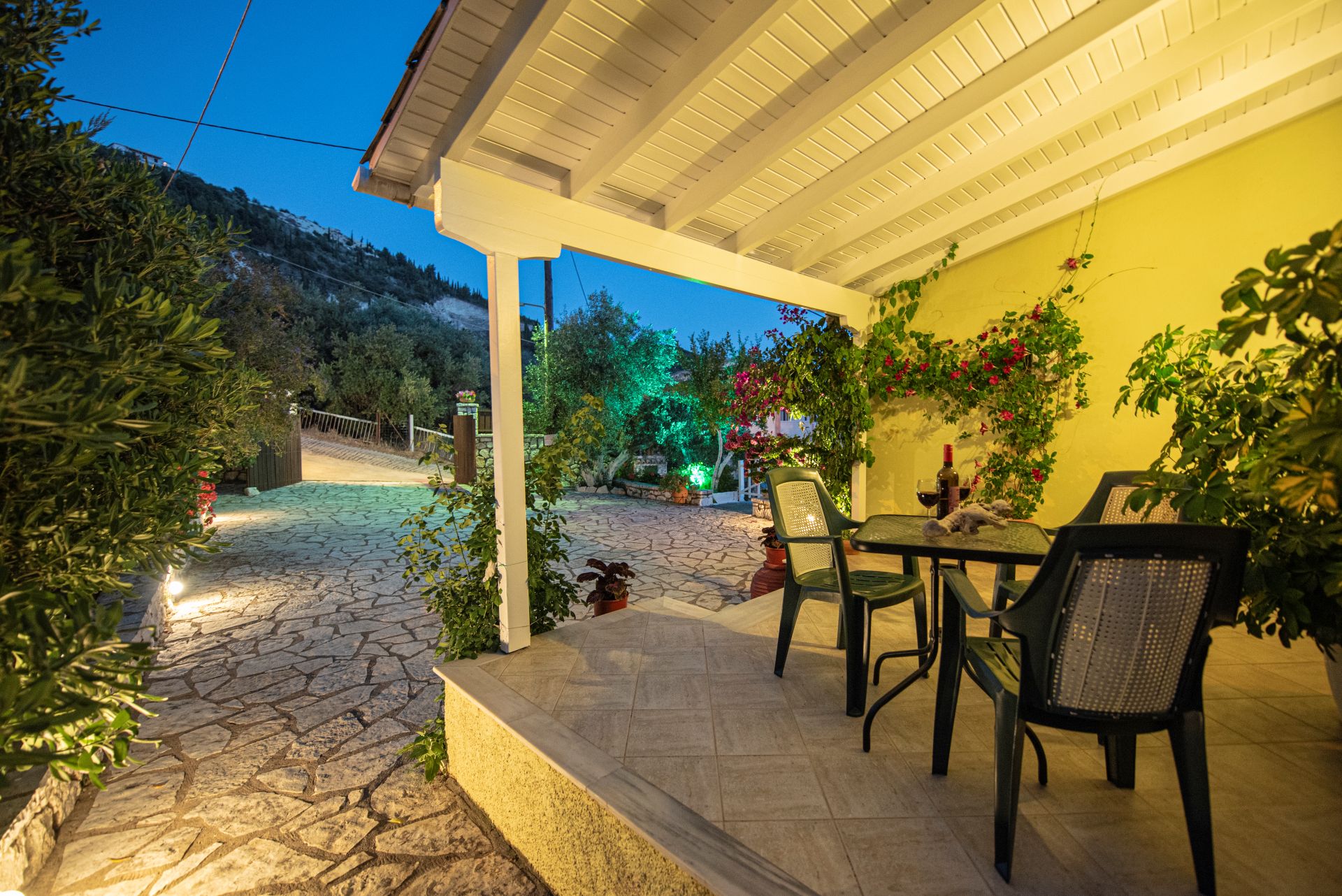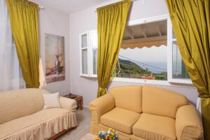 Η βίλα έχει μπαλκόνια εξοπλισμένα με τραπέζια και καρέκλες και εκπληκτική θέα στο Ιόνιο Πέλαγος. Ειδικά στο ηλιοβασίλεμα.